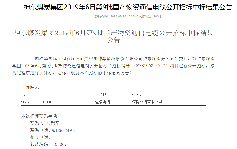 點(diǎn)擊數(shù):61362019-11-21 00:00:00 來(lái)源: 神東煤炭集團(tuán)2019年6月第9批國(guó)產(chǎn)物資通信電纜公開招標(biāo)中標(biāo)結(jié)果公告